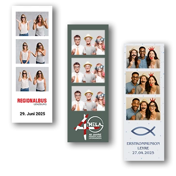 Der handliche Fotostreifen ist das perfekte Give-away, das deine Gäste garantiert mitnehmen. Veredelt mit einem Firmenlogo, Slogan oder im kompletten Corporate Design wird jeder Ausdruck zum sympathischen Marketing-Tool mit Langzeitwirkung. Wir erstellen gerne ein individuelles Layout passend zu deinem Event-Konzept. Sprecht uns gerne an!